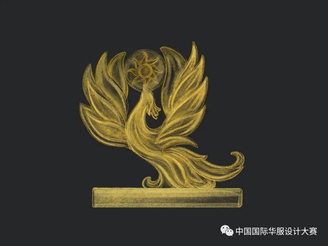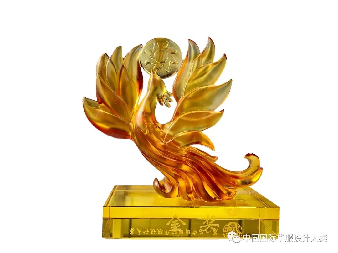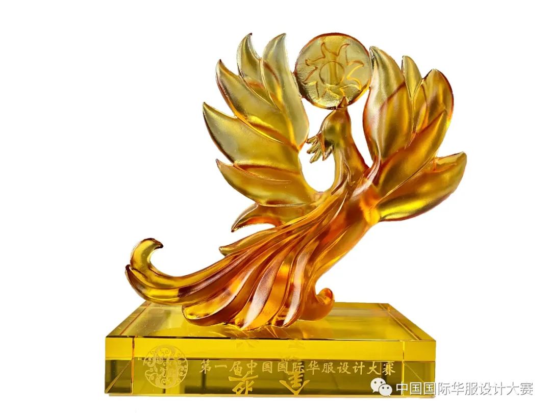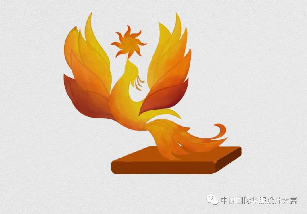 凤凰的头顶是一个太阳,散发着光芒。插上翅膀是获奖选手如同展翅飞翔的凤凰,迎着东方、迎着阳光耀燃而起。华服起 中华兴。此吉祥物指导老师米鸿宾,主设计周锦,设计师曲玉辉。采用山东特产琉璃,用古法琉璃制作手法而成,具有较好的收藏价值。经过不断的修改,最终此作品完美的呈现在大赛总决赛的颁奖仪式上。